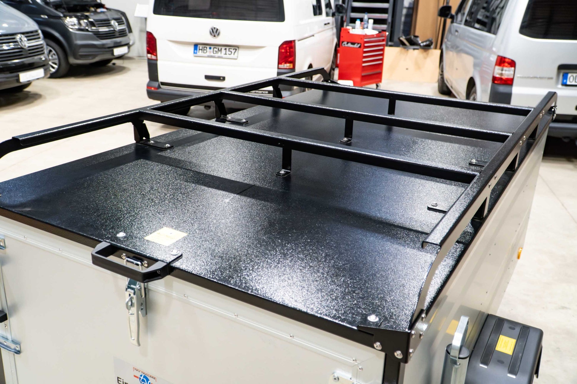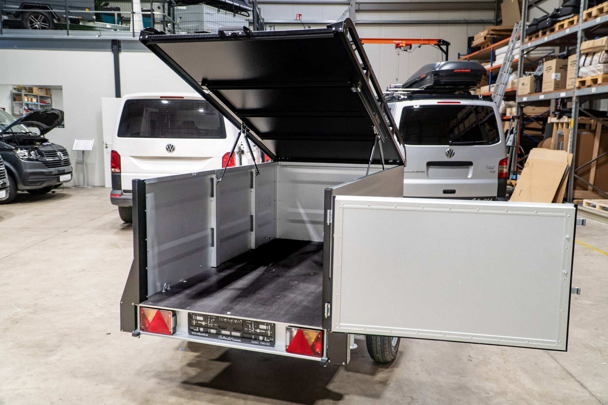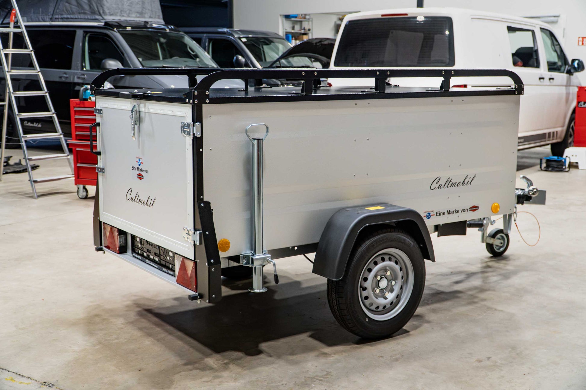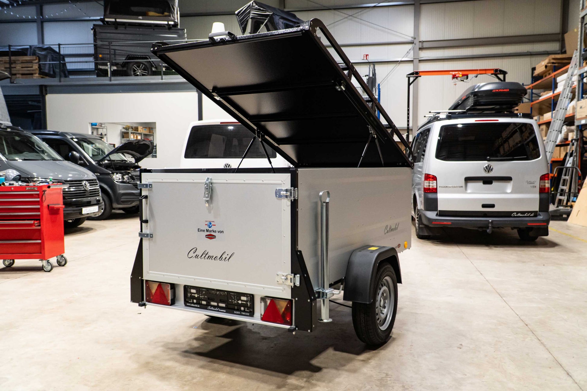 Dieser Dachzelt Anhänger basiert auf einem speziell verstärkten Kofferanhänger und wurde gezielt für die sichere Montage von Dachzelten entwickelt. Er kombiniert geschützten Stauraum mit der Einfachheit des Dachzeltens und der Flexibilität eines kompakten Campinganhängers.