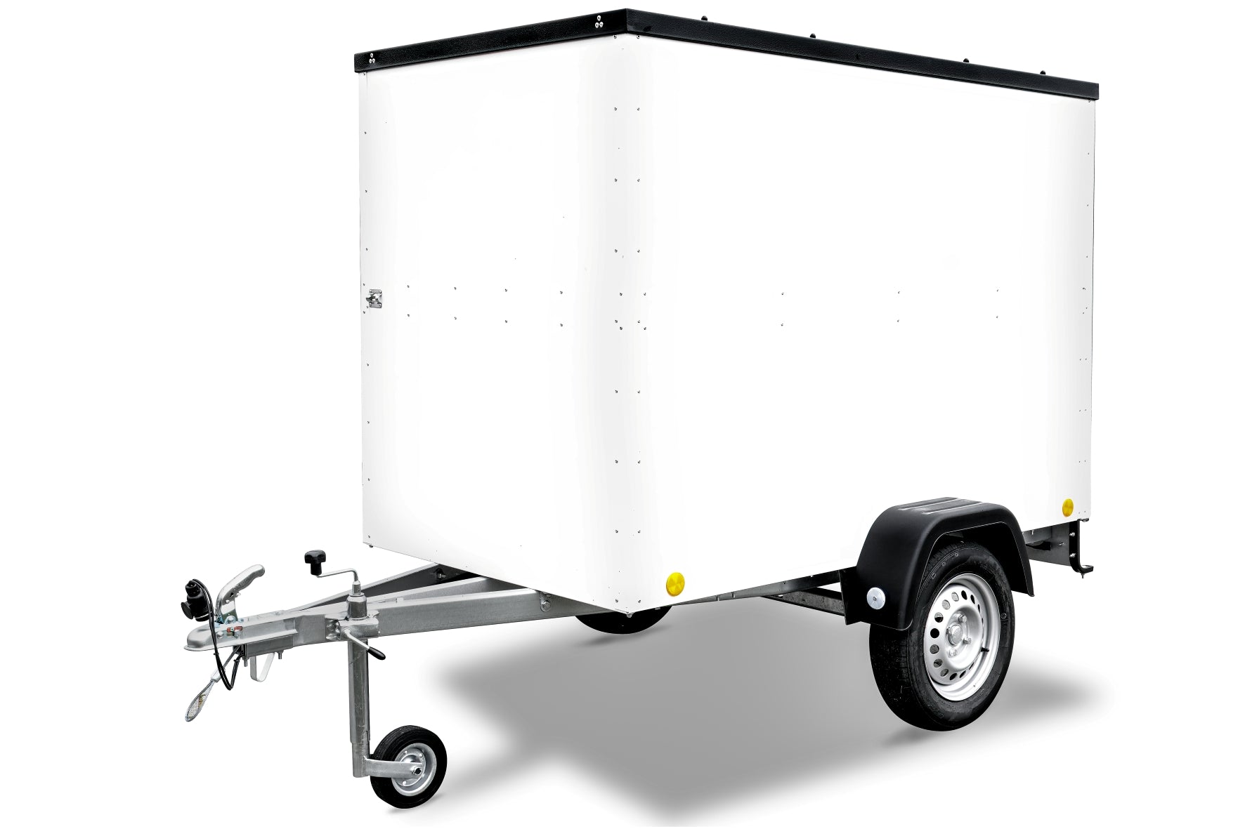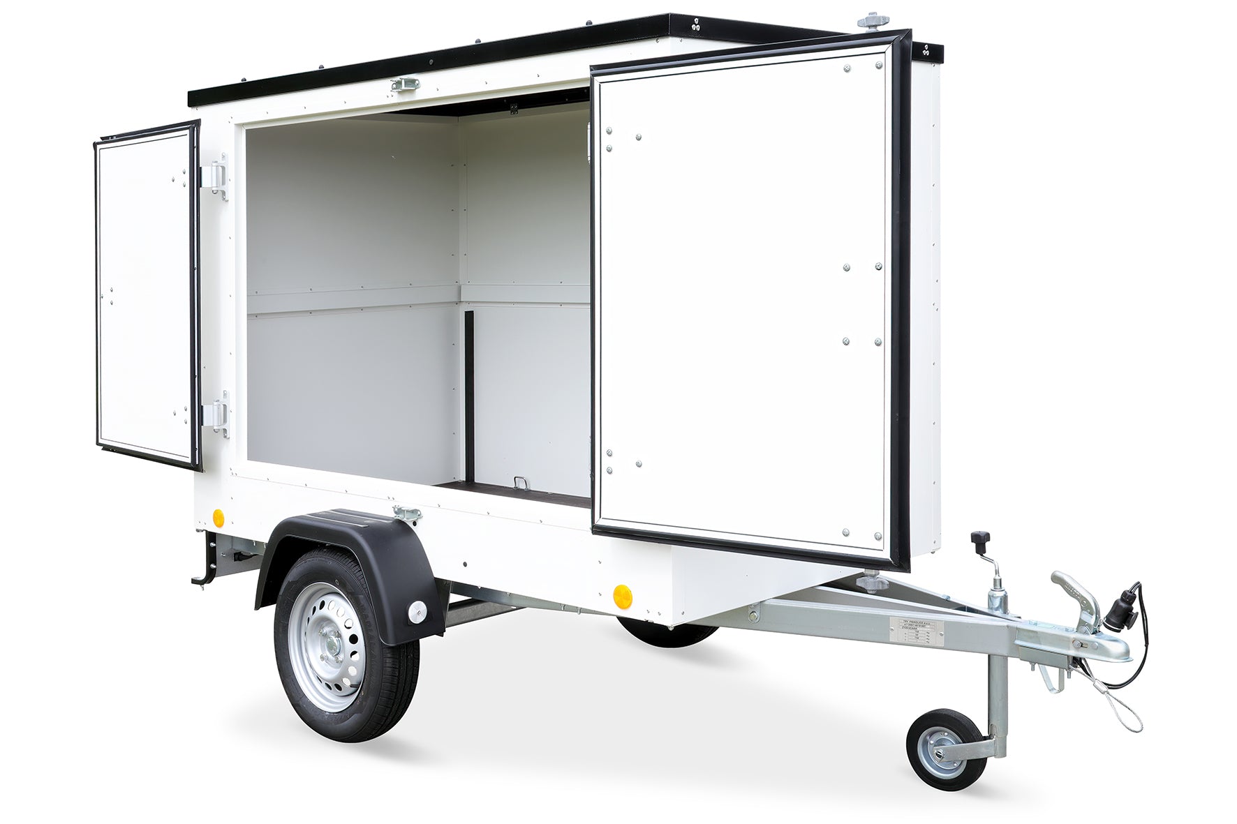 Kleiner Verkaufsanhänger 1.000kg gebremst / Messeanhänger KT-EB2 weiß mit Doppelflügeltür rechts