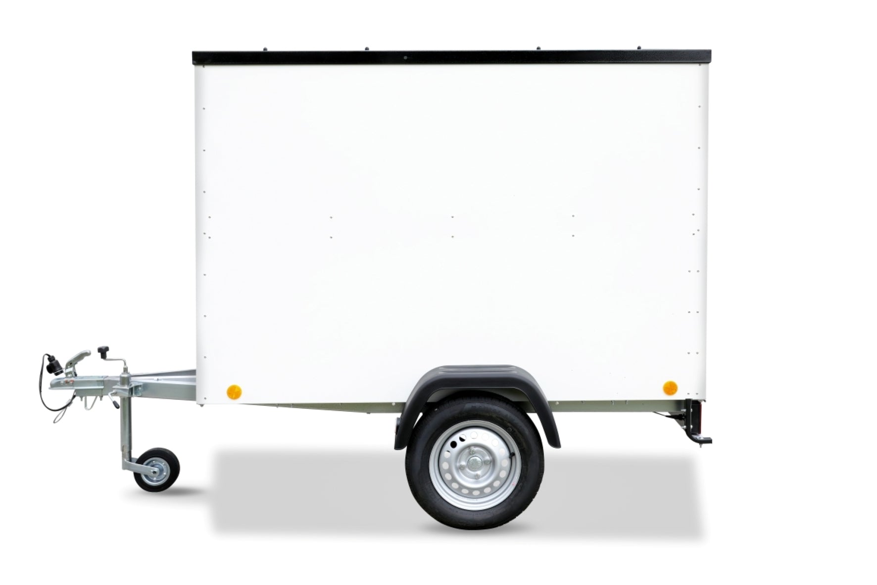 Einachsiger gebremster Verkaufsanhänger mit einer Doppelflügeltür rechts aus Plywood. Die Tür kann um 180 Grad geöffnet werden und bietet die Möglichkeit, Prospektständer oder kleine Regale zu montieren. Der Innenraum ist frei ausbaubar.